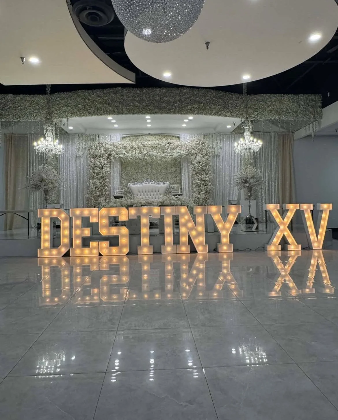 Each marquee piece features warm LED bulbs that create a classy glow and elevate any venue, indoors or outdoors. Letters and numbers can be customized to spell names, ages, years, or short phrases (example: MIS XV, OH BABY, GRAD 2025).